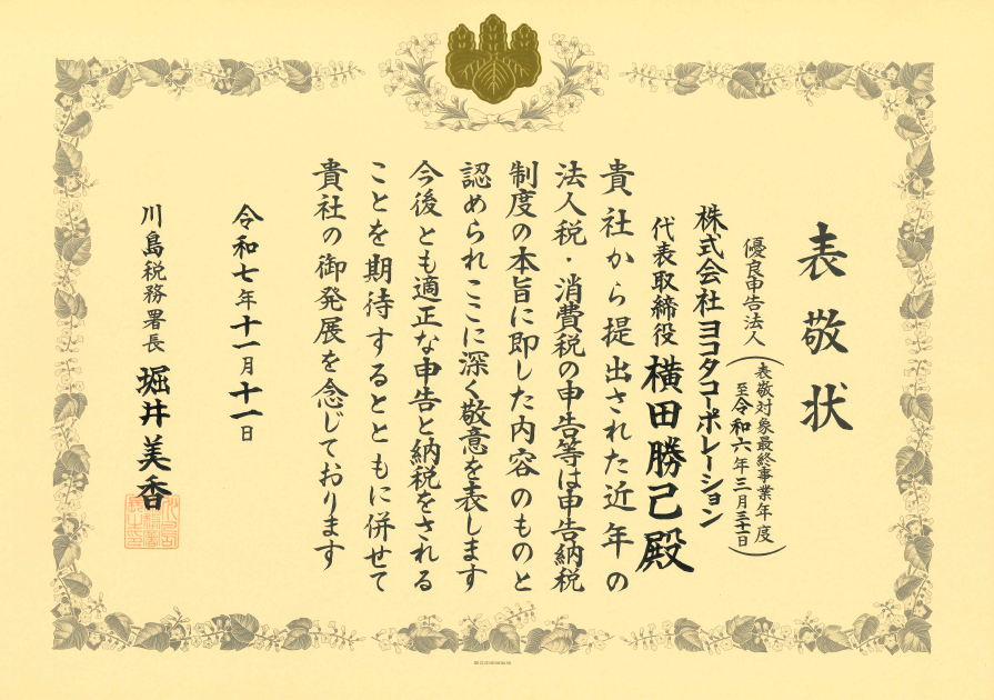ひとえに日頃より弊社の税務行政にご理解とご協力を賜っております取引先の皆さま、そして、法令遵守を徹底し、誠実な申告・納税に日々尽力してくれた従業員一人ひとりの長年の積み重ねの賜物と深く感謝しております。